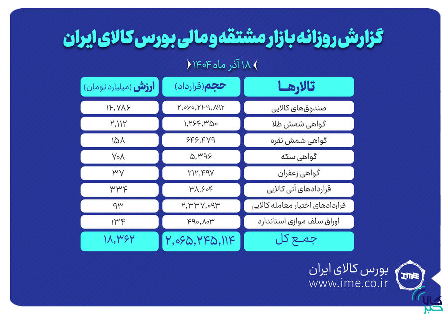 روز گذشته همچنین ۲ میلیون و ۳۳۷ هزار و ۹۳ قرارداد اختیار معامله کالایی به ارزش ۹۳ میلیارد تومان منعقد شد.