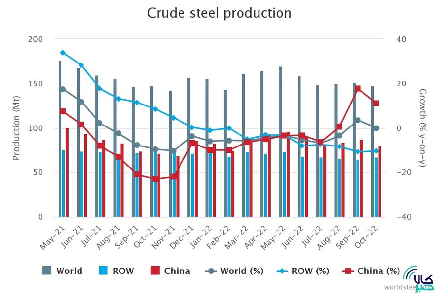 این در حالی است که ۶۴ کشور فولادساز جهان طی اکتبر ۲۰۲۲ میلادی،۱۴۷ میلیون و ۳۰۰ هزار تن فولاد خام تولید کردند که نسبت به مدت مشابه سال گذشته بدون تغییر ماند.