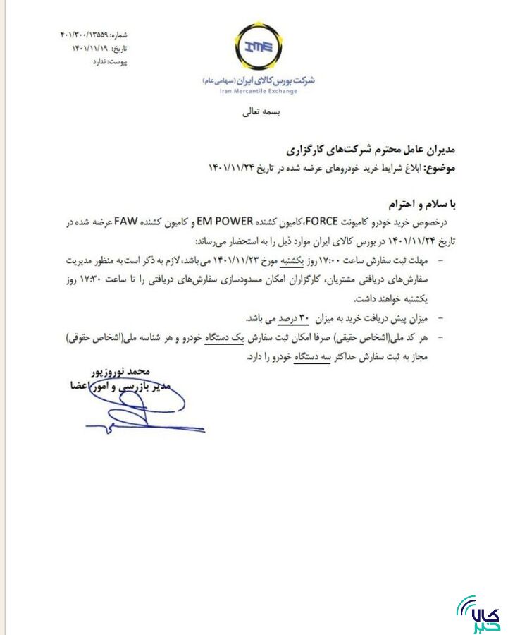 به گزارش کالاخبر ، به این ترتیب در عرضه های روز ۲۴ بهمن که کامیونت فورس، کامیون کشنده امپاور و کامیون کشنده فاو روی تابلو می روند مهلت ثبت سفارش ساعت ۱۷ روز یکشنبه ۲۳ بهمن است و به منظور مدیریت سفارش های دریافتی مشتریان، کارگزاران امکان مسدودسازی سفارش های دریافتی را تا ساعت ۱۷:۳۰ روز یکشنبه خواهند داشت.