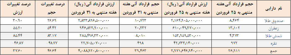 برای صندوق طلا نیز ۱۰ هزار و ۷۲۳ قرارداد به ارزش بیش از ۲۸۳ میلیارد تومان در ۶ موعد تحویلی فروردین، خرداد، مرداد، مهر، آذر و بهمن ۱۴۰۲ در هفته منتهی به ۳۱ فروردین منعقد شد.