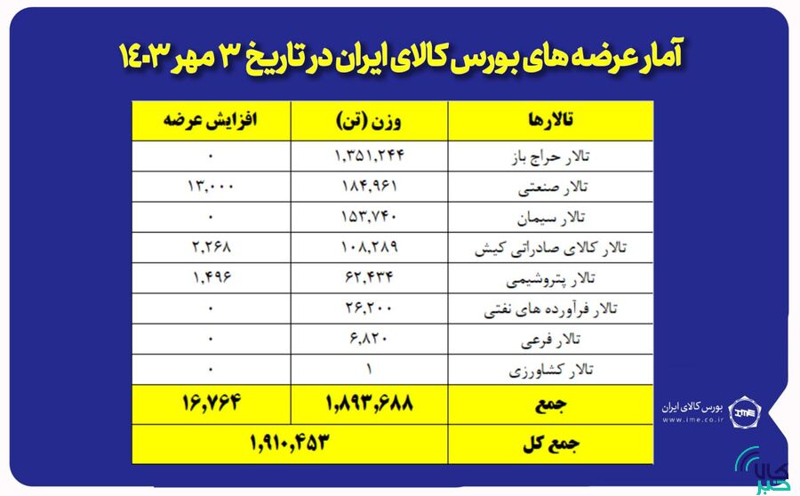 در تالار حراج باز ۷۰۰ هزار تن سنگ آهن کلوخه، ۴۰۰ هزار تن سنگ آهن دانه بندی، ۸۸ هزار تن تختال، ۸۰ هزار تن وکیوم باتوم، ۷۹ هزار و ۵۰۰ تن کنسانتره سنگ آهن و ۳ هزار و ۷۴۴ تن استایرن منومر روی تابلو می رود.
