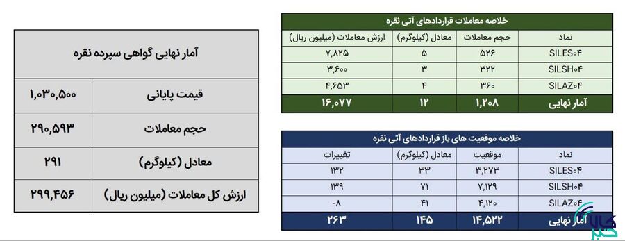 همچنین یک هزار و ۲۰۸ قرارداد آتی معادل ۱۲ کیلوگرم شمش نقره به ارزش ۱.۶ میلیارد تومان منعقد شد. در پایان روز معاملاتی گذشته موقعیت های باز قراردادهای آتی نقره معادل ۱۴۵ کیلوگرم شمش نقره بود. در قراردادهای آتی افزایش ۲۶۳ موقعیت در مجموع موقعیت های باز قراردادهای مبتنی بر نقره بودیم.