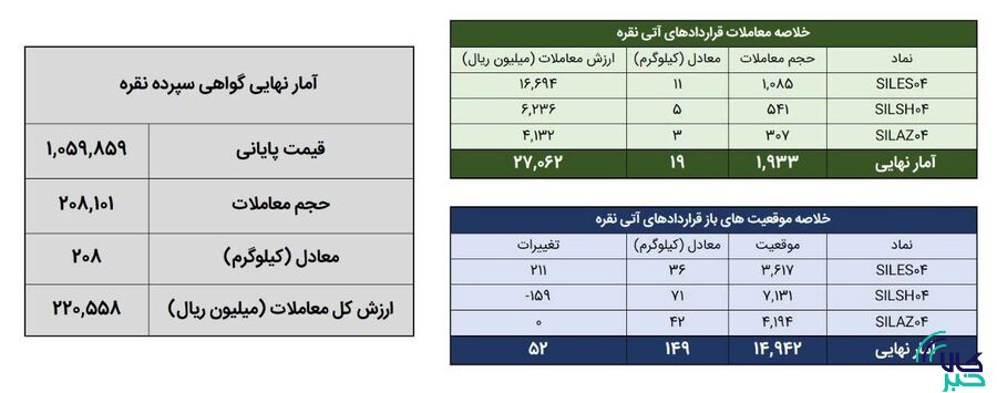 همچنین یک هزار و ۹۳۳ قرارداد آتی معادل ۱۹ کیلوگرم شمش نقره به ارزش ۲.۷ میلیارد تومان منعقد شد. در پایان روز معاملاتی گذشته موقعیت های باز قراردادهای آتی نقره معادل ۱۴۹ کیلوگرم شمش نقره بود. در قراردادهای آتی افزایش ۵۲ موقعیت در مجموع موقعیت های باز قراردادهای مبتنی بر نقره بودیم.
