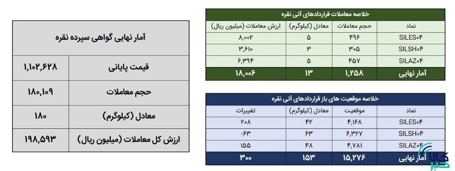 همچنین یک هزار و ۲۵۸ قرارداد آتی معادل ۱۳ کیلوگرم شمش نقره به ارزش ۱.۸ میلیارد تومان منعقد شد. در پایان روز معاملاتی گذشته موقعیت های باز قراردادهای آتی نقره معادل ۱۵۳ کیلوگرم شمش نقره بود. در قراردادهای آتی افزایش ۳۰۰ موقعیت در مجموع موقعیت های باز قراردادهای مبتنی بر نقره بودیم.