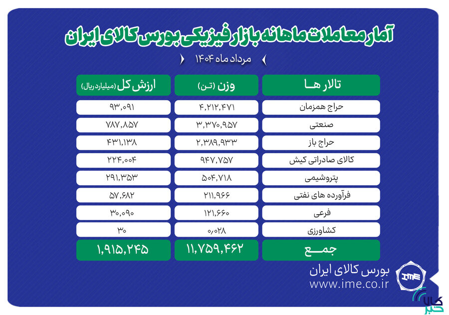 به گزارش کالاخبر ، تالار محصولات صنعتی و معدنی در مرداد ۱۴۰۴ میزبان معامله بیش از ۵ میلیون و ۳۷۷ هزار تن انواع کالا به ارزش ۱۰۹ هزار و ۹۴۷ میلیارد تومان بود.