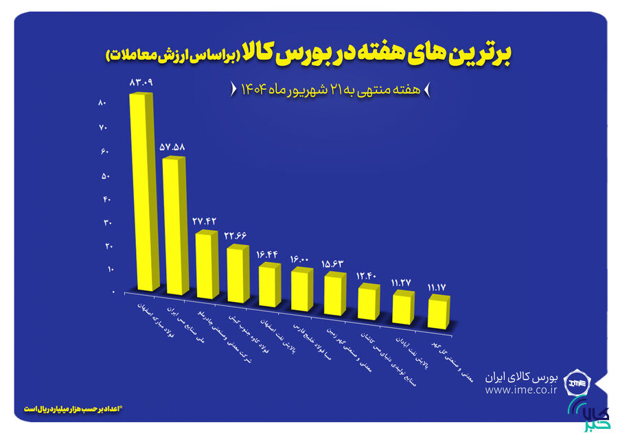 به گزارش کالاخبر، برترین های بورس کالای ایران در هفته منتهی به ۲۱ شهریور ماه براساس ارزش فروش شرکت ها در بازار فیزیکی به شرح زیر است: