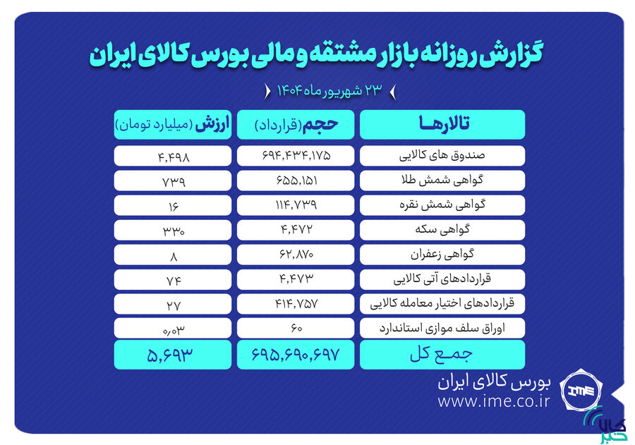 همچنین در معاملات روز ۲۳ شهریورماه بازار مشتقه و مالی، ۶۹۴ میلیون و ۴۳۴ هزار و ۱۷۵ واحد صندوق کالایی به ارزش ۴ هزار و ۴۹۸ میلیارد تومان دست به دست شد. بیشترین ارزش معاملات نیز به صندوق طلای عیار مفید (عیار) اختصاص یافت.