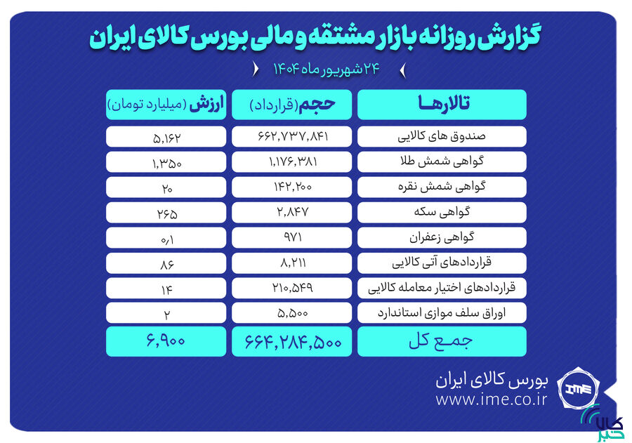 همچنین در معاملات روز ۲۴ شهریورماه بازار مشتقه و مالی، ۶۶۲ میلیون و ۷۳۷ هزار و ۸۴۱ واحد صندوق کالایی به ارزش ۵ هزار و ۱۶۲ میلیارد تومان دست به دست شد. بیشترین ارزش معاملات نیز به صندوق طلای عیار مفید (عیار) اختصاص یافت.