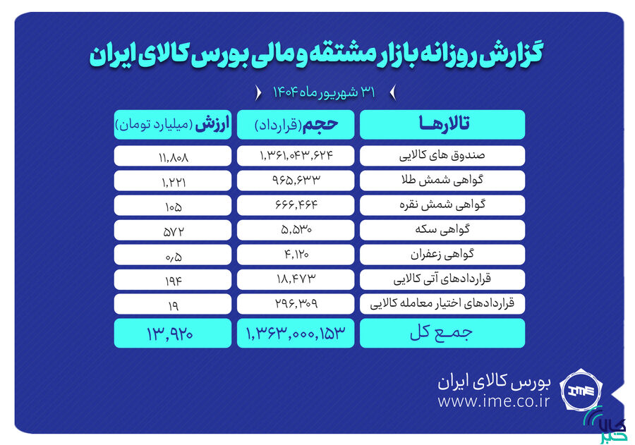همچنین در معاملات روز ۳۰ شهریورماه بازار مشتقه و مالی، یک میلیارد و ۳۶۱ میلیون و ۴۳ هزار و ۶۲۴ واحد صندوق کالایی به ارزش ۱۱هزار و ۸۰۸ میلیارد تومان دست به دست شد. بیشترین ارزش معاملات نیز به صندوق طلای عیار مفید (عیار) اختصاص یافت.