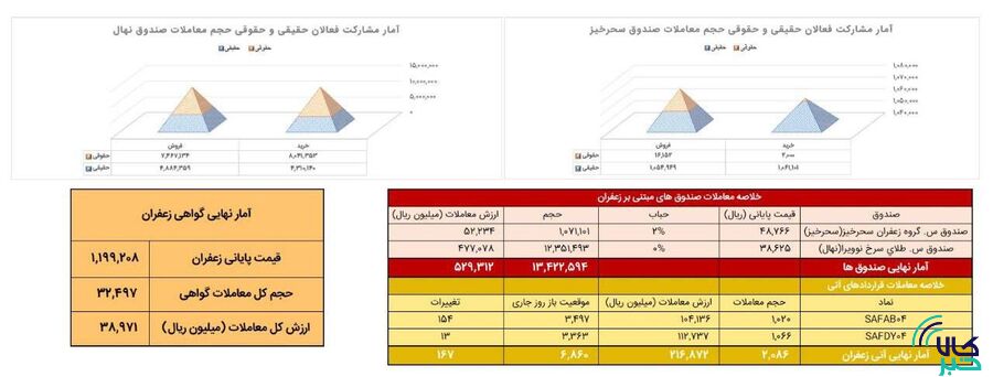 بر اساس آمارهای روز گذشته بازار زعفران، حجم معاملات صندوقهای مبتنی بر زعفران به ۱۳ میلیون و ۴۲۲ هزار و ۵۹۴ واحد رسید و ارزش معاملات ۵۲.۹ میلیارد تومان ثبت شد. میزان مشارکت فعالان حقیقی در حجم معاملات صندوق سحرخیز، در خرید ۹۹ درصد و در فروش ۹۸ درصد بود. این مشارکت برای صندوق نهال نیز برای خرید و فروش به ترتیب ۳۵ و ۴۰ درصد بود.