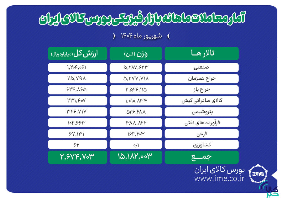 به گزارش کالاخبر ، تالار محصولات صنعتی و معدنی در شهریور ۱۴۰۴ میزبان معامله بیش از ۶ میلیون و ۹۵۲ هزار و ۸۰۰ تن انواع کالا به ارزش ۱۵۸ هزار و ۶۹ میلیارد تومان بود.در این تالار ۳ میلیون و ۳۳۱ هزار و ۲۰۰ تن سنگ آهن، ۲ میلیون و ۲ هزار و ۴۲۸ تن فولاد، یک میلیون و ۴۲۵ هزار و ۹۵۰ تن آهن اسفنجی، ۱۰۶ هزار و ۷۰ تن روی، ۴۵ هزار و ۲۴۵ تن آلومینیوم، ۴۰ هزار و ۳۲۰ تن مس، یک هزار و ۱۰۰ تن کنسانتره مولیبدن، ۴۰۰ تن چدن و ۸۷ تن کنسانتره فلزات گرانبها دادوستد شد.