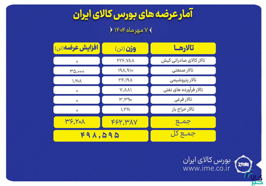 تالارهای بورس کالای ایران امروز دوشنبه ۷ مهر ماه میزبان عرضه ۴۹۸ هزار و ۵۹۵ تن انواع محصول است. بیشترین عرضه امروز متعلق به تالار صنعتی و بعد از آن تالار صادراتی است.