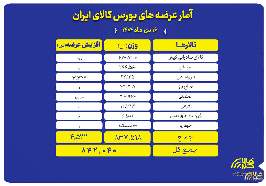 تالارهای بورس کالای ایران امروز سه‌شنبه ۱۶ دی ماه میزبان عرضه ۸۴۲ هزار و ۴۰ تن انواع محصول است.