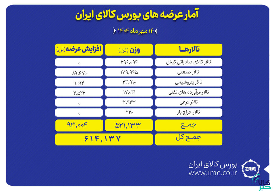 امروز در تالار پتروشیمی و فرآورده های نفتی ۴۵ هزار و ۴۸۵ تن محصول شامل ۲۵ هزار و ۹۲۲ تن مواد پلیمری، ۹ هزار و ۹۲۵ تن قیر، ۶ هزار و ۳۲ تن فرآورده های نفتی و ۳ هزار و ۶۰۶ تن روغن روی میز فروش می رود.