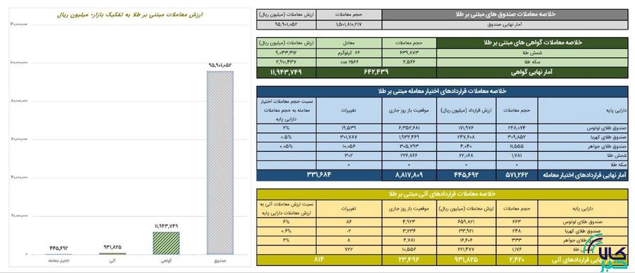 در قراردادهای اختیار معامله مبتنی بر طلا نیز ۵۷۱ هزار و ۲۶۲ قرارداد به ارزش ۴۴ میلیارد تومان دادوستد شد. در قراردادهای اختیار معامله صندوق طلای لوتوس با ۲ درصد بیشترین نسبت حجم معاملات قراردادهای اختیار معامله به حجم معاملات دارایی پایه را داشت.