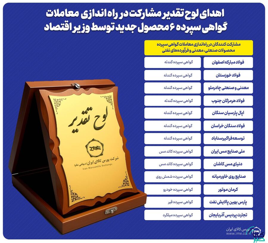 و در گروه میلگرد، شرکت صنعت تجارت پردیس آذربایجان به پاس «مشارکت در توسعه بازار مالی بورس کالا» از سید علی مدنی زاده لوح تقدیر دریافت کردند.