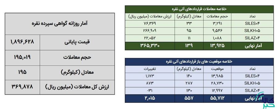 همچنین ۱۳ هزار و ۹۲۵ قرارداد آتی معادل ۱۳۹ کیلوگرم شمش نقره به ارزش ۳۶.۵ میلیارد تومان منعقد شد. در پایان روز معاملاتی گذشته موقعیت های باز قراردادهای آتی نقره معادل ۵۵۷ کیلوگرم شمش نقره بود. در قراردادهای آتی شاهد افزایش ۲ هزار و ۱۵ موقعیت در مجموع موقعیت های باز قراردادهای مبتنی بر نقره بودیم.