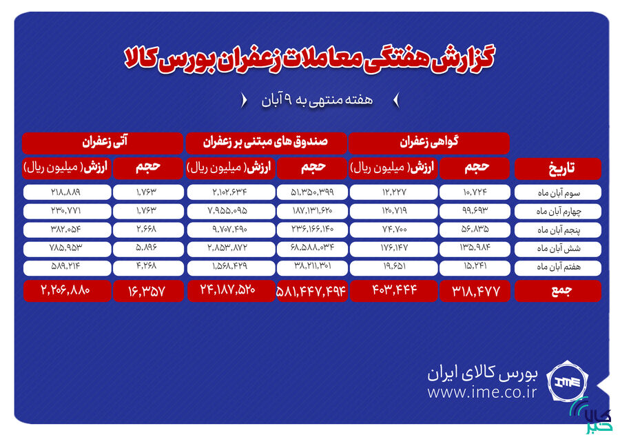 گزارش هفتگی معاملات زعفران نشان می‌دهد که در هفته منتهی به ۹ آبان بیش از ۱.۶ تن زعفران نگین به ارزش ۲۲۰.۷ میلیارد تومان در بازار آتی بورس کالا داد و ستد شد.