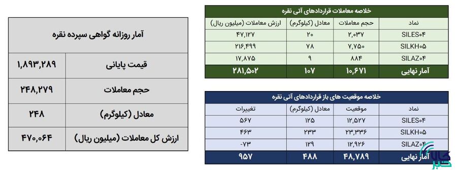 همچنین ۱۰ هزار و ۶۷۱ قرارداد آتی معادل ۱۰۷ کیلوگرم شمش نقره به ارزش ۲۸.۱ میلیارد تومان منعقد شد. در پایان روز معاملاتی گذشته موقعیت های باز قراردادهای آتی نقره معادل ۴۸۸ کیلوگرم شمش نقره بود. در قراردادهای آتی شاهد افزایش ۹۵۷ موقعیت در مجموع موقعیت های باز قراردادهای مبتنی بر نقره بودیم.