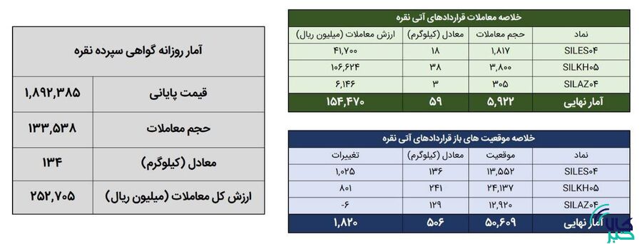 همچنین ۵ هزار و ۹۲۲ قرارداد آتی معادل ۵۹ کیلوگرم شمش نقره به ارزش ۱۵.۴ میلیارد تومان منعقد شد. در پایان روز معاملاتی گذشته موقعیت های باز قراردادهای آتی نقره معادل ۵۰۶ کیلوگرم شمش نقره بود. در قراردادهای آتی شاهد افزایش یک هزار و ۸۲۰ موقعیت در مجموع موقعیت های باز قراردادهای مبتنی بر نقره بودیم.