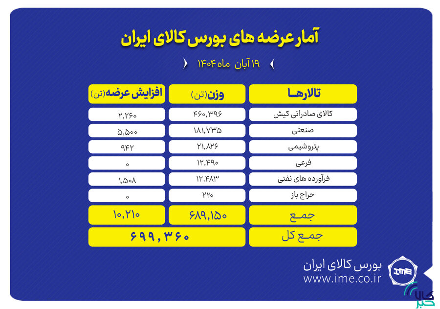 تالارهای بورس کالای ایران امروز دوشنبه ۱۹ آبان ماه میزبان عرضه ۶۹۹ هزار و ۳۶۰ تن انواع محصول است و تالار صادراتی کیش با عرضه بیش از ۴۶۲ هزار تن انواع محصول پیشتاز عرضه های امروز است.
