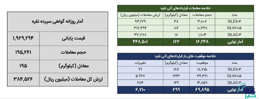 به گزارش کالاخبر ،خلاصه معاملات بازار نقره در روز گذشته نشان می‌دهد که در این روز ۱۹۵ هزار و ۲۶۱ گواهی معادل ۱۹۵ کیلوگرم شمش نقره به ارزش ۳۸.۴ میلیارد تومان دادوستد شد.