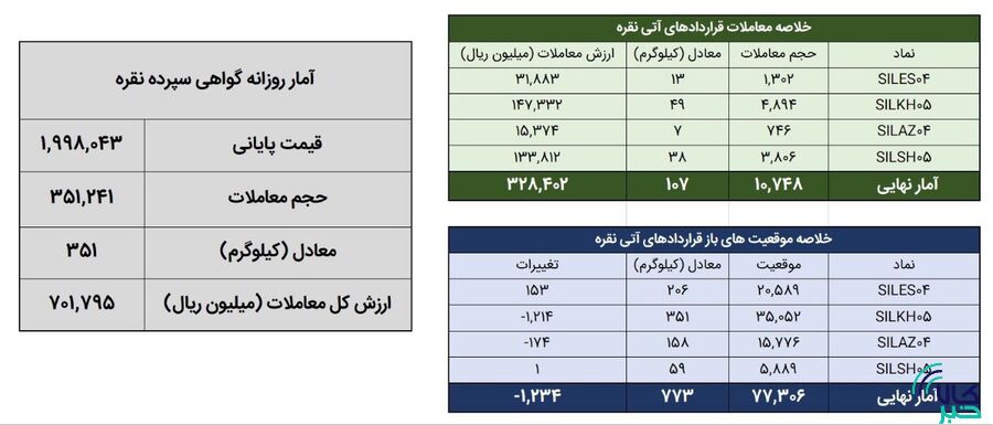 همچنین ۱۰ هزار و ۷۴۸قرارداد آتی معادل ۱۰۷کیلوگرم شمش نقره به ارزش ۳۲.۸ میلیارد تومان منعقد شد. در پایان روز معاملاتی گذشته موقعیت های باز قراردادهای آتی نقره معادل ۷۷۳ کیلوگرم شمش نقره بود. در قراردادهای آتی شاهد کاهش ۱۲۳۴ موقعیت در مجموع موقعیت های باز قراردادهای مبتنی بر نقره بودیم.