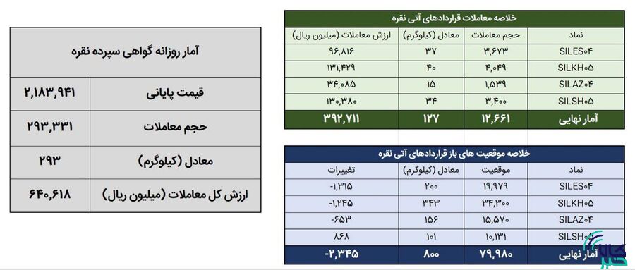 همچنین ۱۲ هزار و ۶۶۱ قرارداد آتی معادل ۱۲۷ کیلوگرم شمش نقره به ارزش ۳۹.۳ میلیارد تومان منعقد شد. در پایان روز معاملاتی گذشته موقعیت های باز قراردادهای آتی نقره معادل ۸۰۰ کیلوگرم شمش نقره بود. در قراردادهای آتی شاهد کاهش ۲۳۴۵ موقعیت در مجموع موقعیت های باز قراردادهای مبتنی بر نقره بودیم.