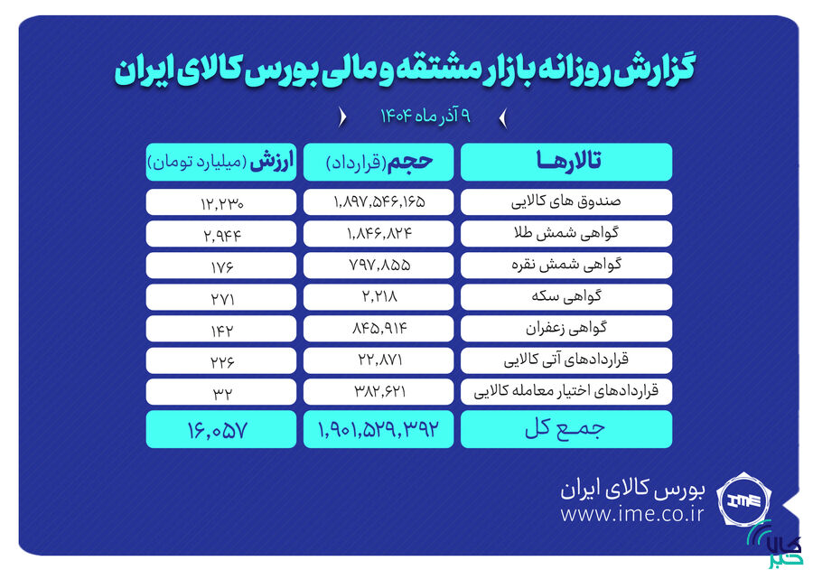 همچنین در معاملات روز یکشنبه بازار مشتقه و مالی، یک میلیارد و ۸۹۷ میلیون و ۵۴۶ هزار و ۱۶۵واحد صندوق کالایی به ارزش ۱۲ هزار و ۲۳۰ میلیارد تومان دست به دست شد.