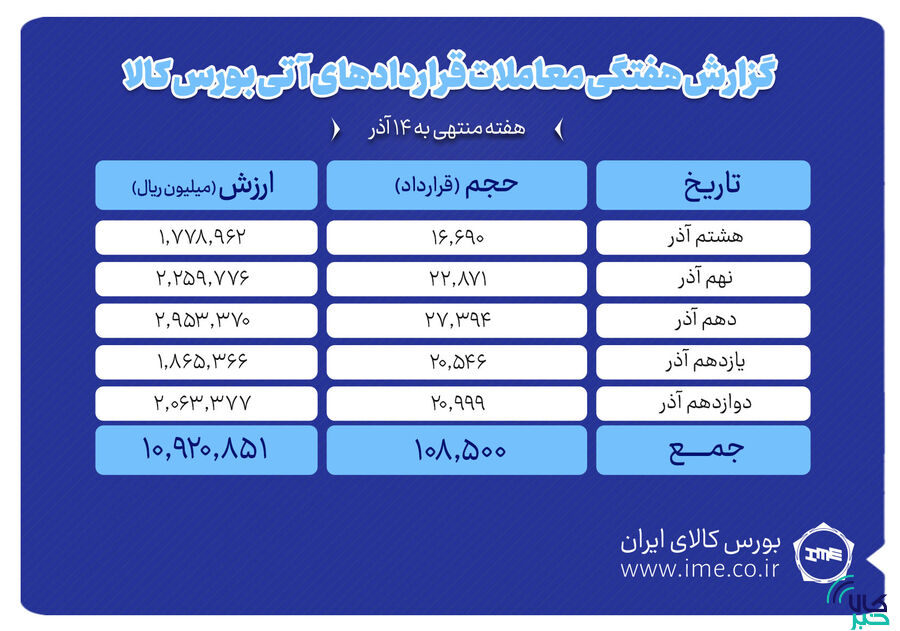 به گزارش کالاخبر ، در هفته گذشته ۱۰۸ هزار و ۵۰۰ قرارداد آتی به ارزش یک همت منعقد شد. بیشترین حجم و ارزش معاملات نیز به روز ۱۰ آذرماه اختصاص یافت به طوری که در این روز ۲۷ هزار و ۳۹۴ قرارداد به ارزش بیش از ۲۹۵ میلیارد تومان منعقد شد.