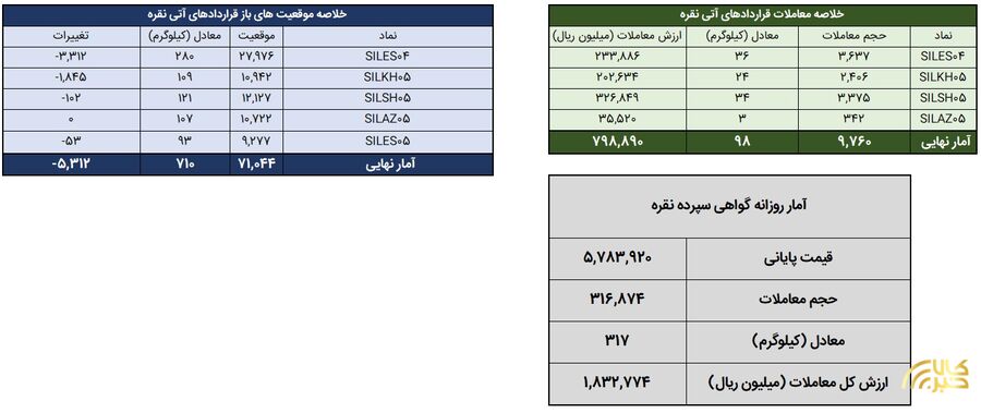 روز گذشته (۶ بهمن ماه) درمجموع ۴۱۴ کیلوگرم شمش نقره در بازار گواهی سپرده و قرارداد آتی بورس کالا مورد معامله قرار گرفت.