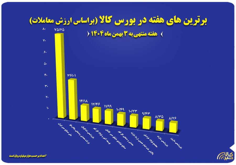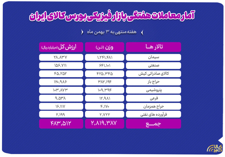 آمار معاملات بازار فیزیکی بورس کالای ایران نشان می دهد در هفته منتهی به ۳ بهمن ماه حدود ۲ میلیون و ۳۷۸ هزار تن انواع کالا و محصول به ارزش بالغ بر ۴۲.۴ هزار میلیارد تومان معامله شد. همچنین ارزش معاملات ۱۰ شرکت برتر به بیش از ۱۹.۷ هزار میلیارد تومان رسید.