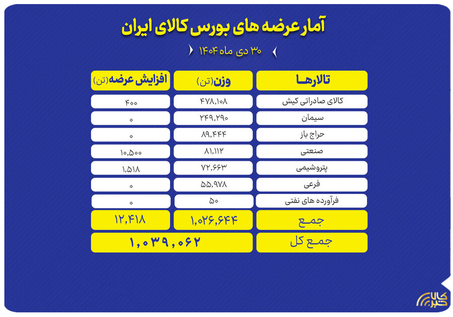 تالارهای بورس کالای ایران امروز سهشنبه ۳۰ دی ماه میزبان عرضه یک میلیون و ۳۹ هزار و ۶۲ تن انواع محصول است.