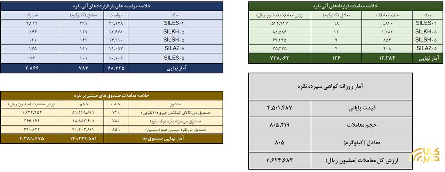 روز گذشته (۲۹ دی ماه) درمجموع ۱۳۵۰ کیلوگرم شمش نقره در بازار گواهی سپرده و قرارداد آتی بورس کالا مورد معامله قرار گرفت. ارزش معاملات صندوق های مبتنی بر نقره نیز بیش از ۱۴.۲ میلیارد تومان بود.