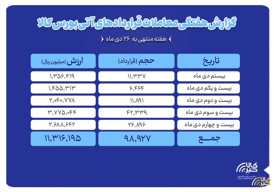 بررسی روند معاملات قراردادهای آتی بورس کالای ایران درهفته منتهی به ۲۶ دی ماه نشان می دهد که در هفته گذشته ارزش معاملات بازار آتی به بیش از هزار و ۱۳۱ میلیارد تومان رسید.