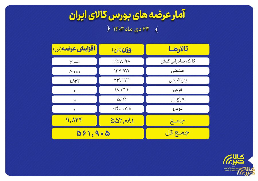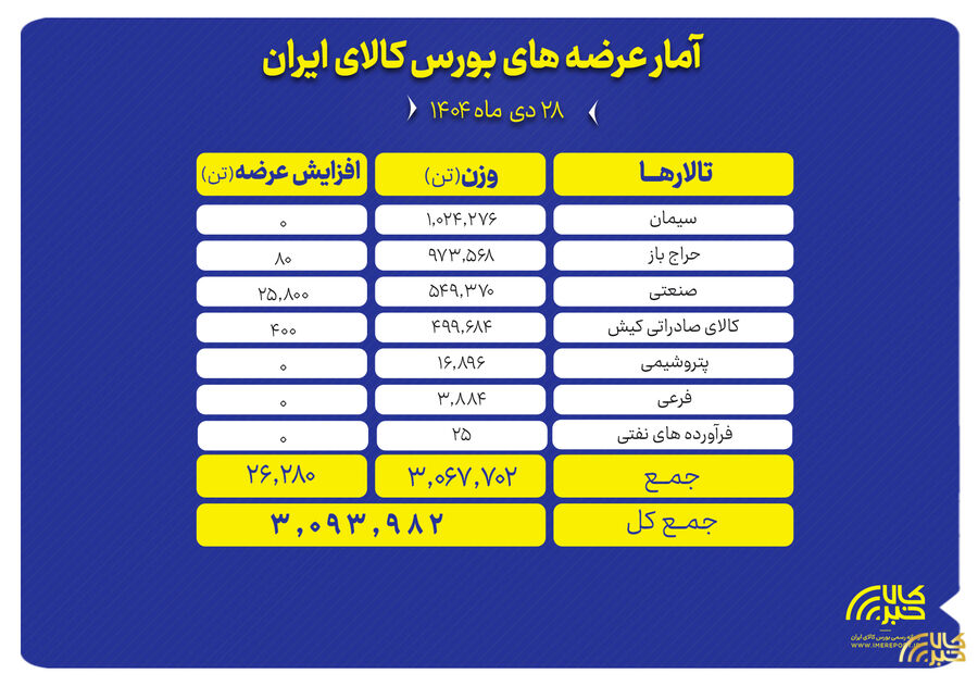 تالارهای بورس کالای ایران امروز یکشنبه ۲۸ دی ماه میزبان عرضه ۳ میلیون و ۶۷ هزار و ۷۰۲ تن انواع محصول است.