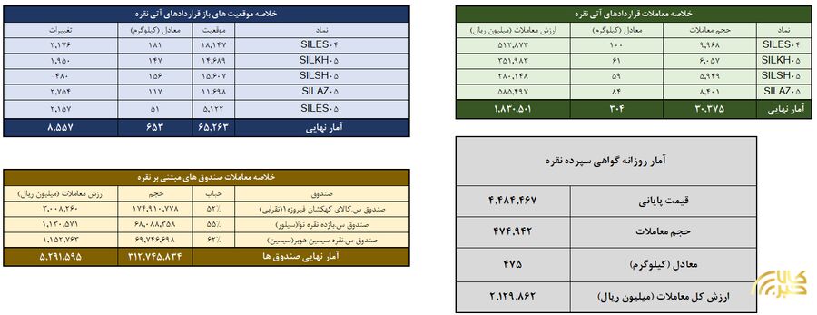 روز گذشته (۲۳ دی ماه) درمجموع ۷۷۹ کیلوگرم شمش نقره در بازار گواهی سپرده و قرارداد آتی بورس کالا مورد معامله قرار گرفت. ارزش معاملات صندوق های مبتنی بر نقره نیز بیش از ۵۲۹.۱ میلیارد تومان بود.